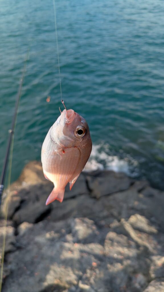 開始前の足元チェックでも磯際からでてくる無数のエサ取り。イシモチからマイクロコッパ、チャリコにフグ。 オンパレードとはこのこと・・・・