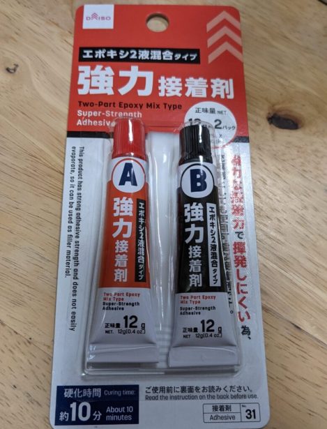 今回色々な接着剤をホームセンターで見ましたが、価格差があまりよくわからなかったので接着力の強いと言われている2液混合接着剤を100均で見つけたので今回はこれで接着します。